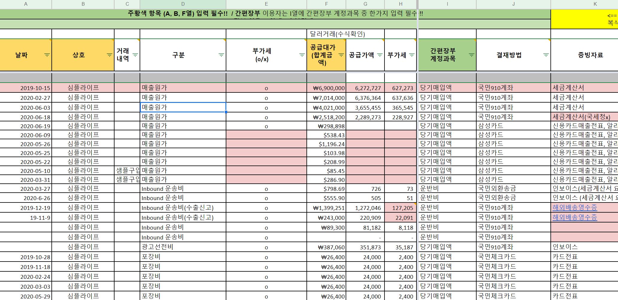 거래가 발생하였을경우, 날짜, 거래 방법, 증빙자료(세금계산서 등)의 간편 장부는 엑셀로 작성하고 있습니다 (첨부 파일 참고)